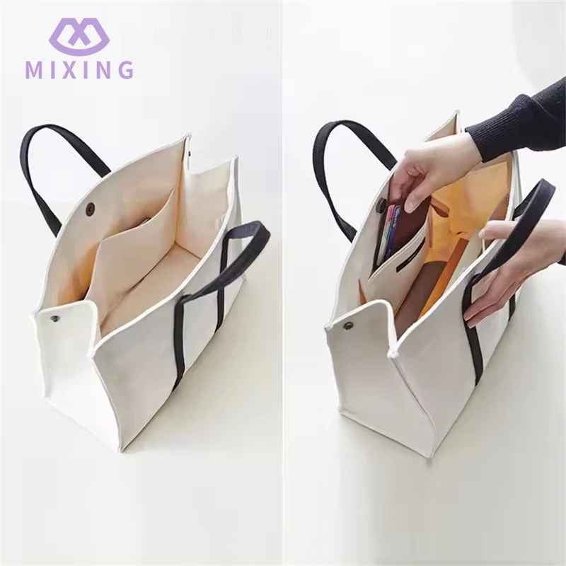 วัสดุผ้าใบที่ใช้ในกระเป๋าผ้าแคนวาสธรรมดาพร้อมหูหิ้วที่ผลิตโดยซัพพลายเออร์ Mixing ให้ความรู้สึกหนาแต่ไม่ยุ่งยาก ต่างจากถุงผ้าใบบางๆ บางประเภทที่นุ่มและนิ่ม โดยสามารถรักษาความแข็งได้ในระดับหนึ่งหลังจากเติมสิ่งของแล้ว จะไม่ทำให้สิ่งของเสียรูปภายใต้ความกดดัน และดูสม่ำเสมอมากขึ้น