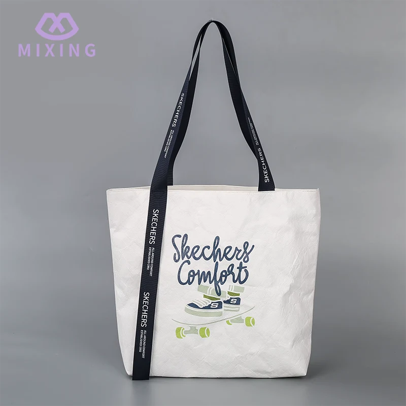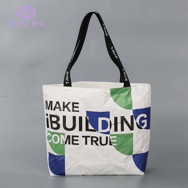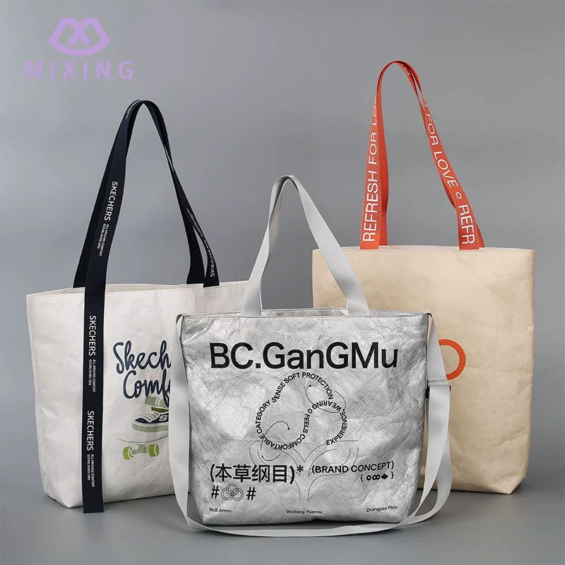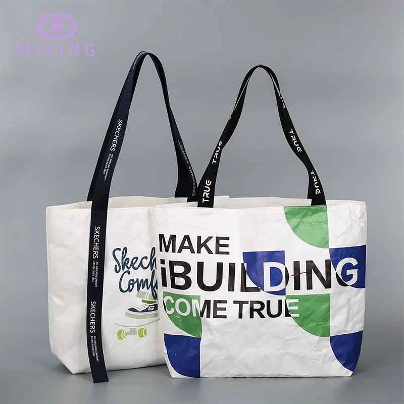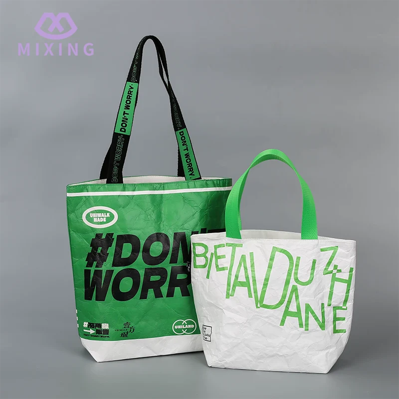 โลโก้ของถุง Tyvek พร้อมโลโก้ของ Mixing เป็นแบบปั๊มความร้อนหรือการพิมพ์ซิลค์สกรีนซึ่งสามารถเลือกได้ตามสี ไม่ใช่สติ๊กเกอร์ราคาถูกหรืออิงค์เจ็ท โลโก้ปั๊มความร้อนให้ความรู้สึกไม่เรียบเล็กน้อยเมื่อสัมผัส และไม่สูญเสียหมึกเมื่อถูกับเสื้อผ้าหรือโต๊ะ โลโก้ที่พิมพ์ด้วยซิลค์สกรีนจะมีสีสว่างกว่าและเข้ากับสีพื้นหลังของกระเป๋าได้เป็นอย่างดี จะไม่มีการเยื้องศูนย์หรือขอบเบลอ แม้ว่ากระเป๋าจะเป็นสีอ่อนแต่โลโก้ก็ยังสามารถแสดงได้ชัดเจนและไม่ดูเป็นสีเทา